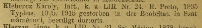 1916. május 11-én az első világháborús Hírek a sebesültekről és betegekről című közlöny 487. számában Klebercz Károly gyalogos neve is előkerül.