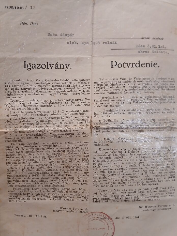 Dóka Gáspár, Dóka Lajos és Nemes Terézia 1928-ban születt fia a kitelepítést követően a Nyírségben alapított családot.