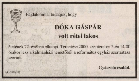 Dóka Gáspár sosem nyugodott bele a kitelepítés igazságtalanáságába, utolsó kívánságaként rétei földet szórtak koporsójára, melyet szülőfalujából hozott Kálmánházára.