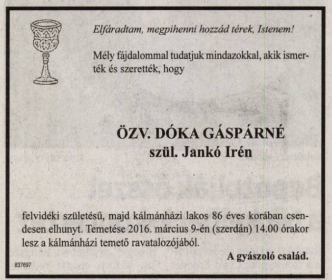 Szabóné Dóka Erzsébet – Dóka Gáspár leánya
