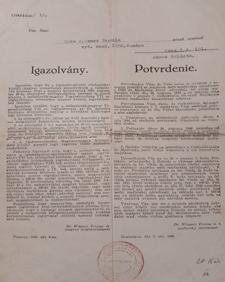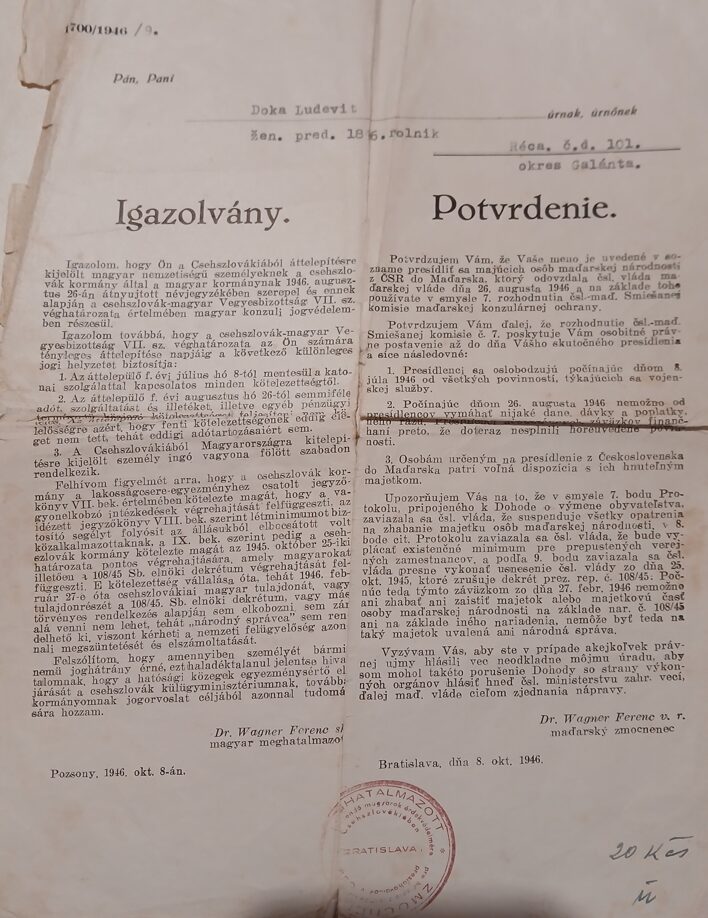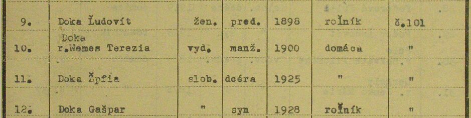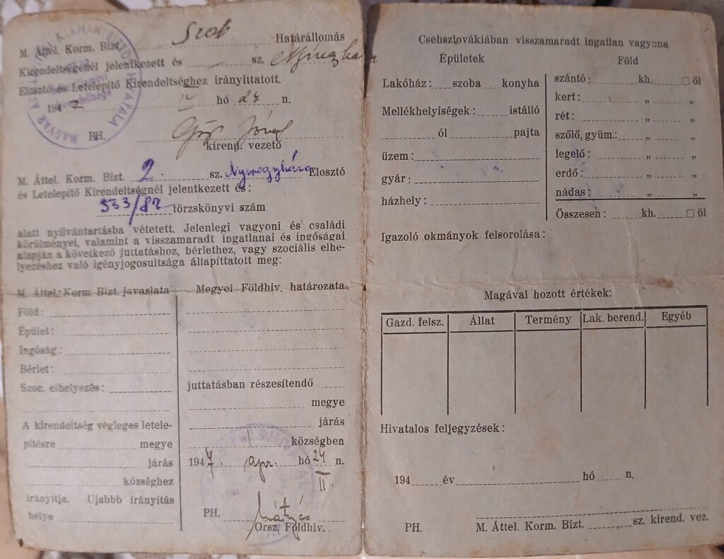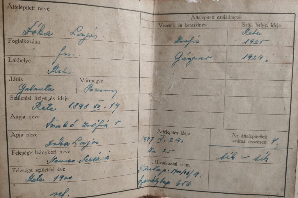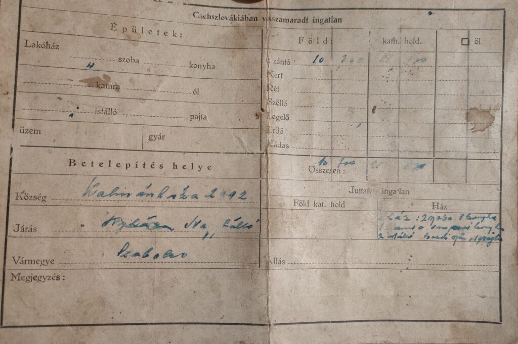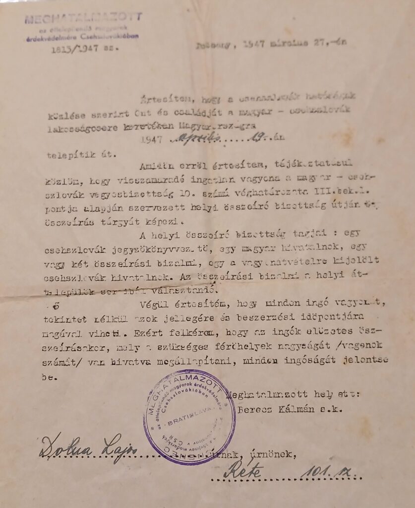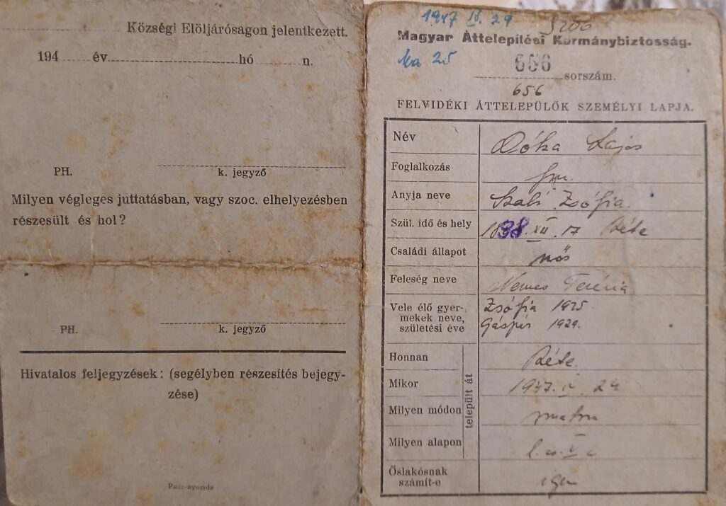 Lajos és Terézia házát és földjeit és ingatlanjait az állam lefoglalta. A családot 1947. április 24-én, az Ma-25-ös számú transzporttal deportálták Magyarországra, Kálmánházára.