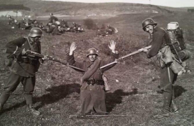 A „letartóztatott” Pál István, Gergely Péter (jobbra) főiskolai évfolyamtársa és jóbarátja egy komáromi gyakorlaton (1942)