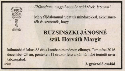Horváth Margit Ruzsinszki Jánossal alapított családot. Házasságukból egy leánygyermek született, Ilona (Pivnyik Lászlóné). Margit 2016-ban hunyt el; férjével együtt ő is a kálmánházi új temetőben nyugszik.