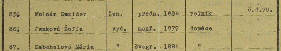 A második világháborút a család szerencsésen átvészelte, ám 1946-ban Jankó Gáspár felesége elhunyt. Az özvegyen maradt, nyolcvanadik életévéhez közeledő gazdát a csehszlovák hatóságok – sok más felvidéki magyarhoz hasonlóan – a kollektív bűnösség elve alapján kitelepítésre ítélték. Vagyonát elkobozták, és magyarellenes intézkedések sorát kellett elszenvednie. 1947. május 16-án az Ma.55. számú transzporttal hagyta el szülőfaluját.