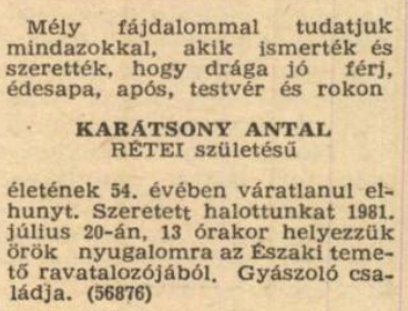 Karátsony Antal Szabó Sándor és Sándor Eszter leányát, Juliannát vette feleségül. A nyírségi megyeszékhelyen, Nyíregyházán telepedtek le. Antal villanyszerelőként dolgozott, szorgalmas, kétkezi munkával teremtette meg családja biztos megélhetését. Egy leánygyermekük született, Valéria.