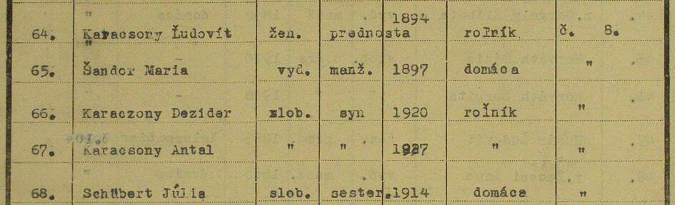 Kitelepítésre ítélték többek között Lajos öccsét, Istvánt és feleségét, Lánczi Rozáliát; mostohaanyját, Vincze Zsófiát; valamint féltestvéreit, Mihályt és Ilonát. Rétét el kellett hagynia unokahúgának, Schubert Juliannának is, aki Lajos nővérének leánya volt. Pontosabban Schubert József és Karátsony Julianna egyetlen lánya, aki Domoszlón született 1914. január 20-án, azonban Karátsony Lajoséknál nevelkedett.