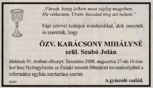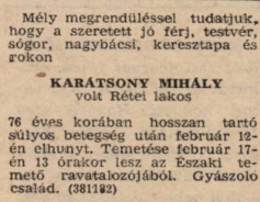 Karátsony Mihály 1984. február 12-én hunyt el. Özvegye 2008 nyarán tért meg Teremtőjéhez. Mindketten Nyíregyházán nyugszanak.