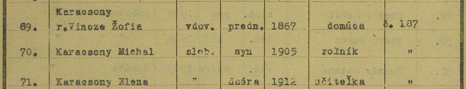A két férjet eltemető és két világháborút átélt özvegyasszonyt a kisemmizés és a kényszerű száműzetés egészségileg súlyosan megviselte. Özv. Karátsony Benőné Vincze Zsófia néhány hónappal a deportálást követően, 81 éves korában elhunyt.