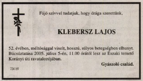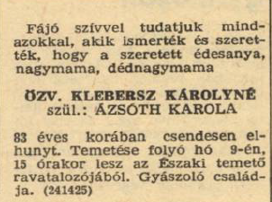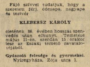 Klebersz Károly 1975-ben hunyt el, felesége, Karolina 1981-ben követte őt. Mindketten Nyíregyházán találtak végső nyugalomra.