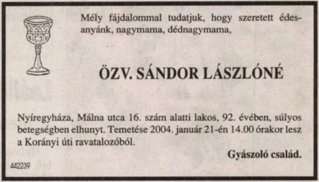 Sándor László 1961-ben, felesége 2004-ben hunyt el, mindketten a nyíregyházi temetőben nyugszanak.
