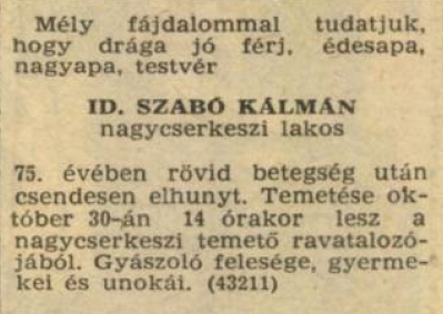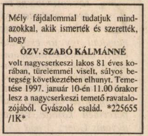 Az özvegy Szabó Lajos Nyíregyházán hunyt el.