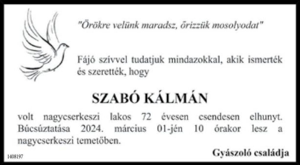 Szabó Kálmán 2024-ben hunyt el, szüleivel nyugszik a nagycserkeszi temetően.