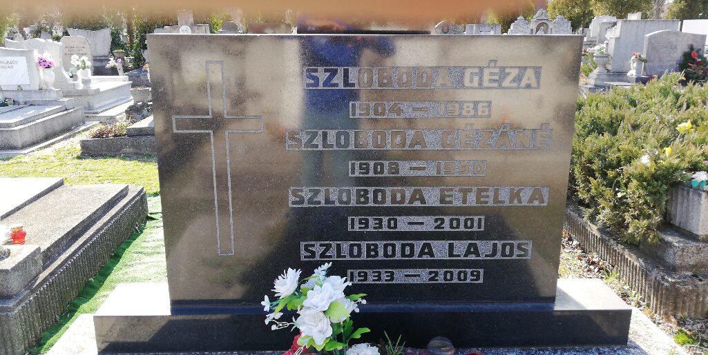 Szloboda Géza 1986-ban hunyt el, felesége, Anna 1990-ben követte. A pesterzsébeti temetőben nyugszanak lányukkal, Etelkával, aki 2001-ben hunyt el, valamint fiukkal, Lajossal, aki 2009-ben halt meg.