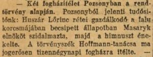 – Két fogházitélet Pozsonyban a rendtörvény alapján. Pozsonyból jelenti tudósítónk: Huszár Lőrinc rétei gazdálkodó a falu korcsmájában becsípett állapotban Masaryk elnököt szidalmazta, majd a himnuszt…